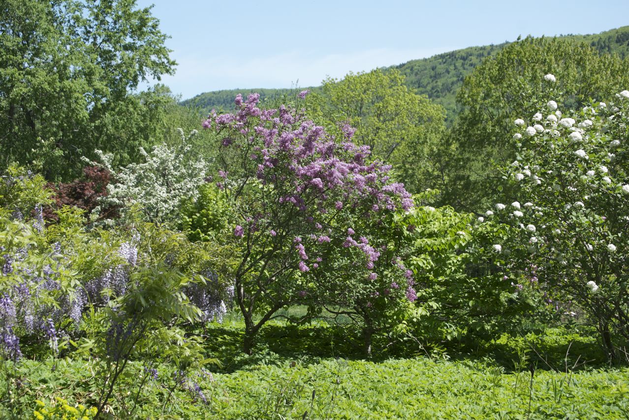 Looking up from the south lower garden towards the Rock Maples, spring exhales blossoms from every twig of Apple, lilac, Viburnum and Magnolia.