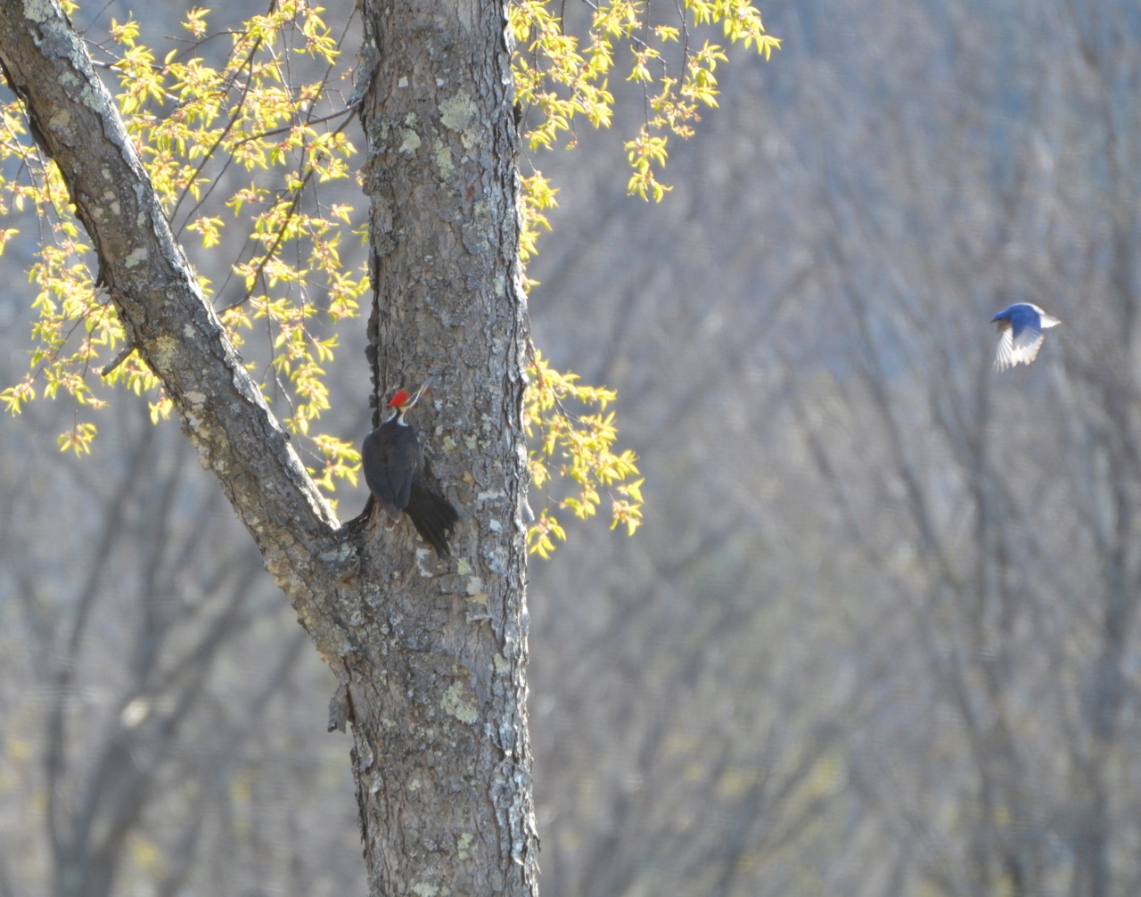 I am guessing the Pileated female is as bemused as I . . . with this bellicose Bluebird behavior. It is not as though she was close to his nest box. Perhaps Ms. Pileated was making too much noise. It is comical to see such a large bird ruffled by a much smaller one. Not surprising really, as I have seen hummingbirds chasing hawks in the past. Parents become fearless when protecting their young.